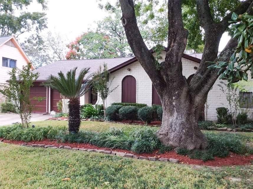 Clean and wonderfully updated home in the heart of Spring Branch, near major freeways, shopping and medical; recently tiled entry opens to formal dining room; large family room has wood burning fireplace, dry bar and patio doors; primary bedroom has wood-look laminate flooring, ceiling fan, dressing area with granite counters, and TWO walk-in closets; primary bath has oversized shower; 2 of the secondary bedrooms have walk-in closets, carpet and ceiling fans; large Jack-n-Jill bath connects hallway and two bedrooms; one bedroom used as study/home office has carpet, a built-in desk with keyboard tray and shelves in closet; garage converted to create second living area, large storage area and utility room; split plan; beautiful shaded backyard with covered patio plus 10x10 wooden deck, and rock path leading to lawn swing that stays; storage building; recent a/c, ductwork and roof. This home has not flooded!